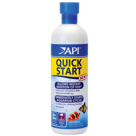 In a new aquarium, harmful ammonia and nitrite build up from fish waste, often resulting in fish loss or new tank syndrome . The unique, patented nitrifying bacteria in API QUICK START Freshwater and Saltwater Aquarium Nitrifying Bacteria are scientifically proven to quickly consume ammonia and nitrite to help prevent fish loss. API QUICK START Freshwater and Saltwater Aquarium Nitrifying Bacteria allows immediate addition of fish to a new freshwater or saltwater aquarium as it immediately starts the aquarium cycle. This treatment also helps to maintain an active biological filter in an established aquarium for healthy water conditions. API QUICK START contains live, nitrifying bacteria.