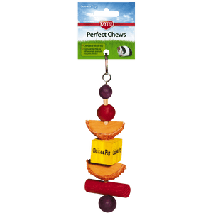 • The Perfect Chew for guinea pigs includes orange slices, wood balls, a wood log and a block in brilliant orange, red and yellow colors