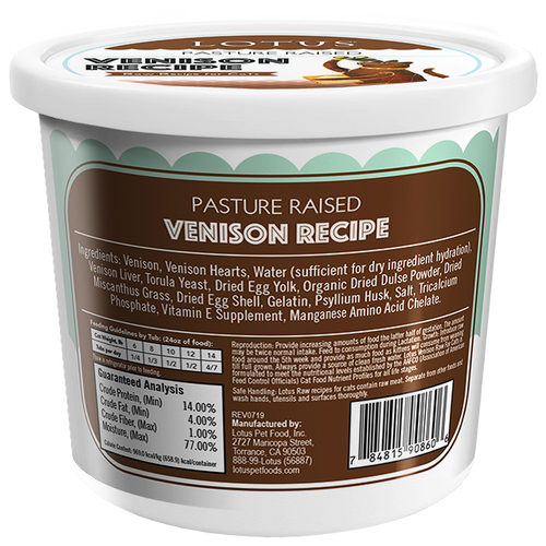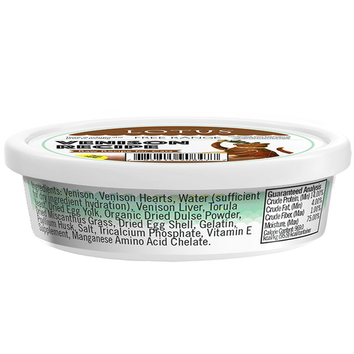 Venison, Venison Hearts, Water sufficient for dry ingredient hydration, Venison Liver, Torula Yeast, Dried Egg Yolk, Organic Dried Dulse Powder, Dried Mis canthus Grass, Dried Egg Shell, Gelatin, Psyllium Husk, Salt, Tricalcium Phosphate, Vitamin E Supplement, Maganese Amino Acid Chelate