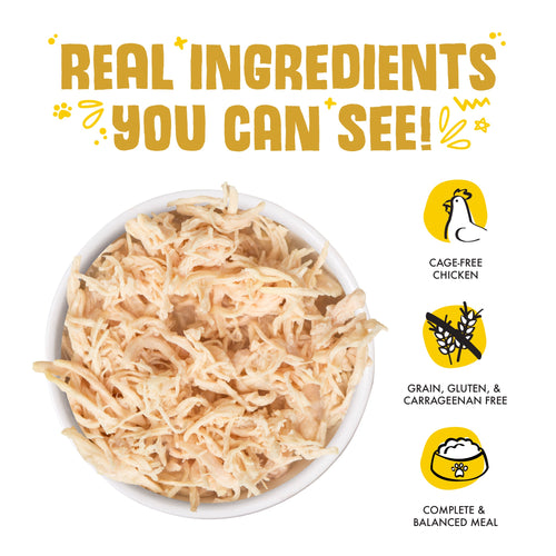 Chicken (Boneless, Skinless Breast), Chicken Broth, Potato Starch, Sunflower Seed Oil, Calcium Lactate, Xanthan Gum, Tricalcium Phosphate, Choline Chloride, Taurine, Zinc Sulfate, Vitamin E Supplement, Ferrous Sulfate, Nicotinic Acid (Vitamin B3), Thiamine Mononitrate (Vitamin B1), Calcium Pantothenate, Copper Sulfate, Riboflavin Supplement (Vitamin B2), Pyridoxine Hydrochloride (Vitamin B6), Vitamin A Supplement, Manganese Sulfate, Vitamin D3 Supplement, Folic Acid, Potassium Iodide, Sodium Selenite, Biotin, Vitamin B12 Supplement